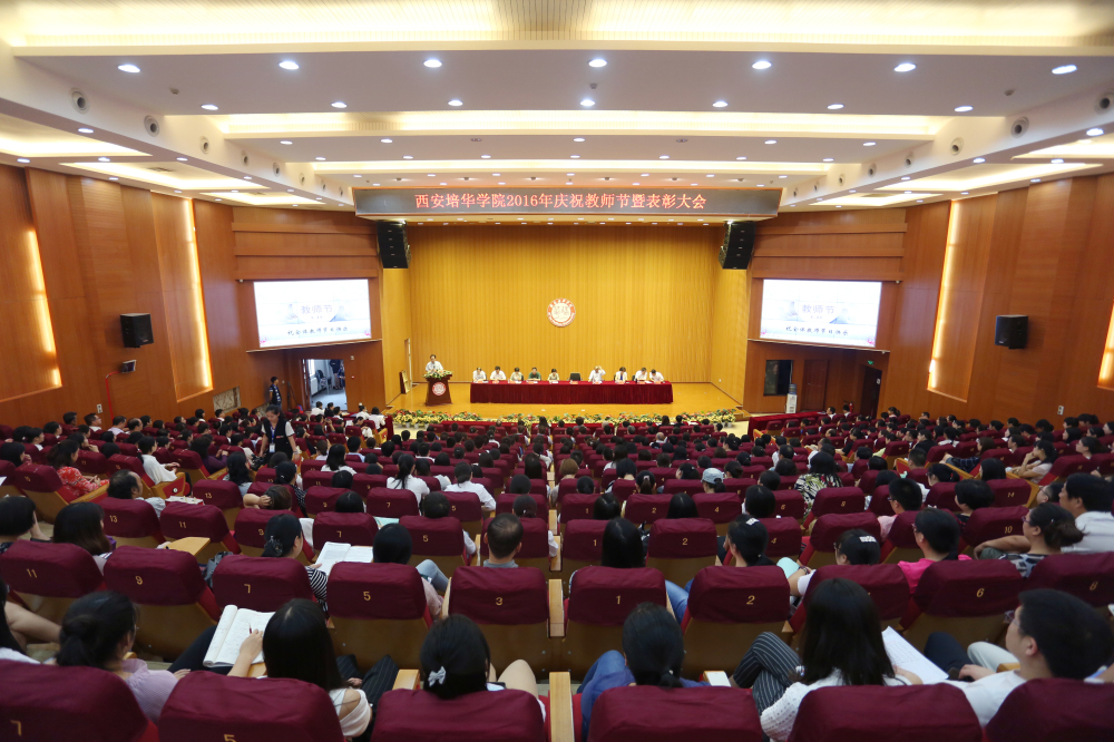 9月9日下午14时30分,我校在长安校区维之图书馆报告厅隆重举行庆祝2016年教师节暨表彰大会,理事长姜波、党委书记周庆华、校长王拴才、副校长陈胜秋、刘越莲、姚文静、于国亮、徐国富,校长助理姜涛、秦海锋到会,各二级院(部)领导、机关处(室)干部、省级教学名师、省级师德标兵、省级教学成果奖获得者、优秀教师、优秀学工干部等获奖教师及学生代表约500名师生参会,共同庆祝第32个教师节并向获奖教师进行祝贺!