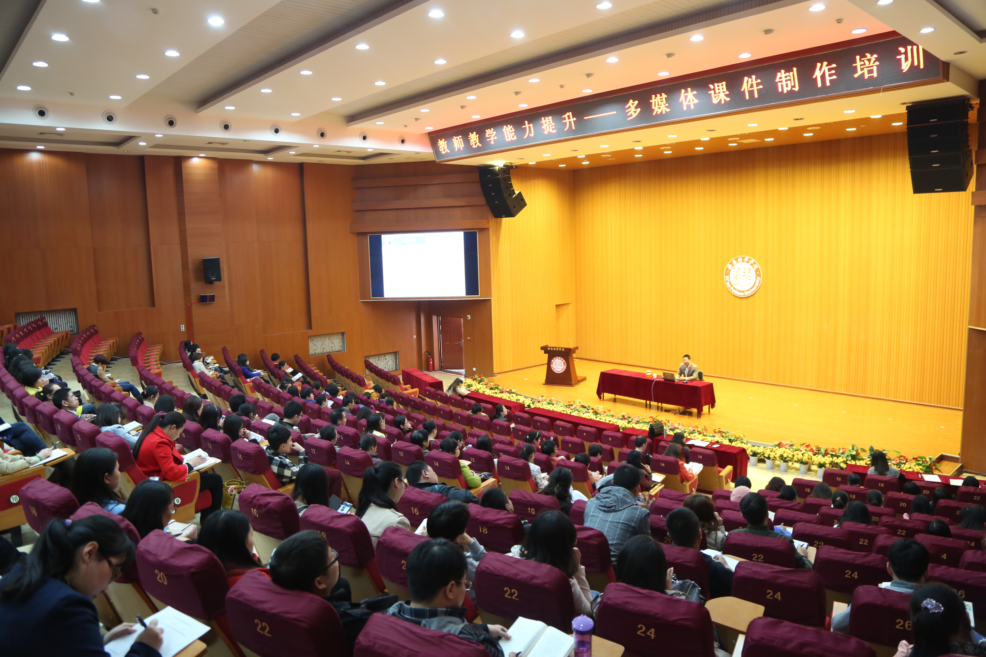 第一场以“教师教学能力提升——多媒体课件制作培训”为主题,主要讲述了关于多媒体课件制作的相关流程及制作方法。首先,杨老师阐述了多媒体课件的内涵及特点;其次,分析了多媒体课件的类型、设计的基本原则以及标准化设计流程;再次,讲授了CAI的概况及特点,列举了常用的多媒体创作工具;最后,PPT布局与颜色设计以及经典PPT案例的展示极大地吸引了在座几百位教师的眼球。