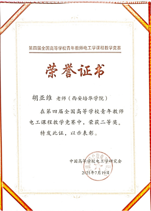 7月19日,学校青年教师胡亚维在代表陕西省高校教师参加的第四届全国高等学校青年教师电工课程教学竞赛中荣获二等奖。