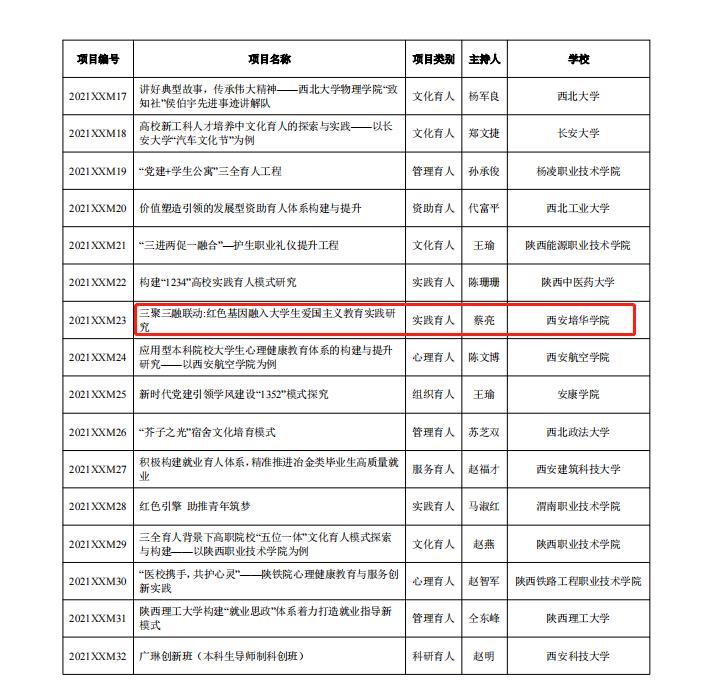 学校学生服务中心主任蔡亮老师主持的《三聚三融联动:红色基因融入大学生爱国主义教育实践研究》获得学生工作精品项目立项,传媒学院党委副书记高嘉炜老师主持的《新时代陕西民办高校辅导员培训体系构建研究》获得学生工作研究课题立项。