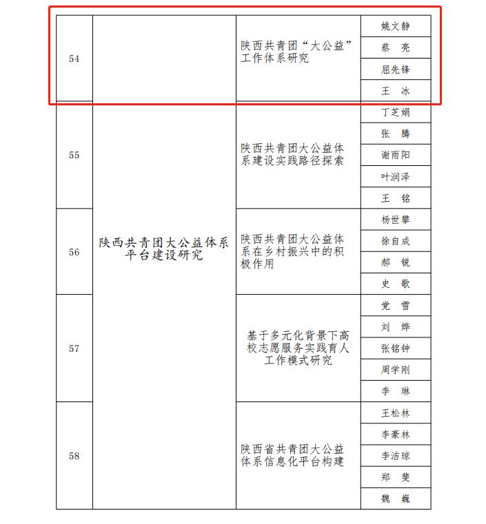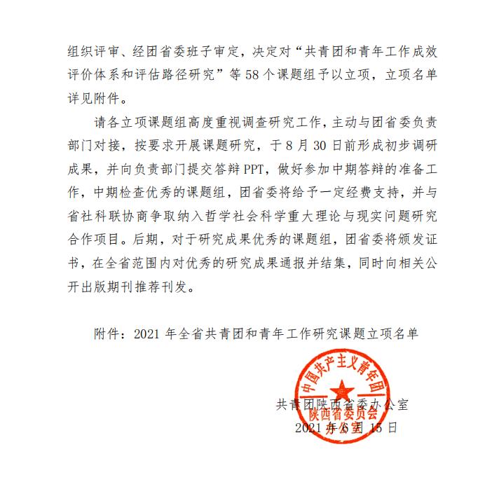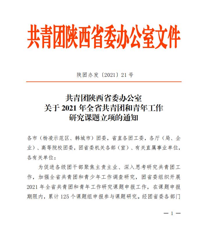近日,共青团陕西省委办公室发布关于2021年全省共青团和青年工作研究课题立项的通知,学校姚文静副校长主持的《陕西共青团“大公益”工作体系研究》课题获得立项。