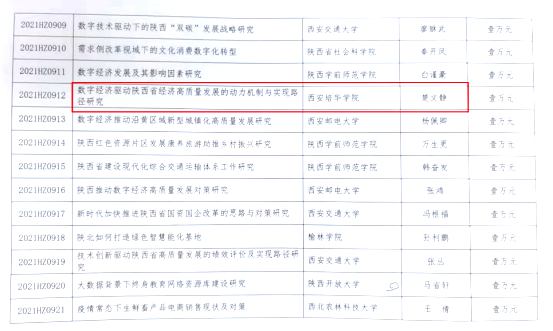 学校会计与金融学院楚文静老师主持的《数字经济驱动陕西省经济高质量发展的动力机制与实现路径研究》项目获得重点项目立项。