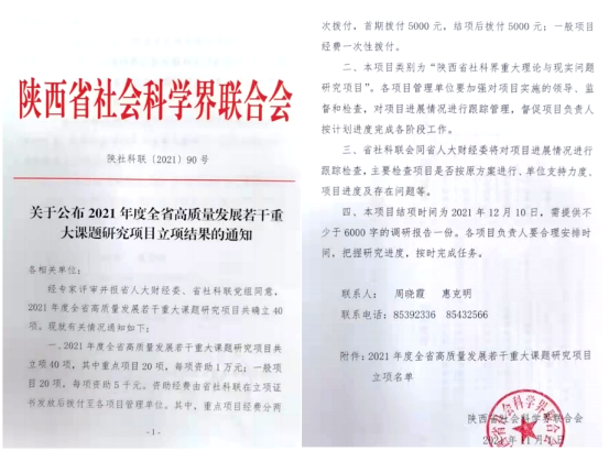 近日,陕西省社科联、陕西省人大财政经济委员会联合发布《关于公布2021年度全省高质量发展若干重大课题研究项目立项结果的通知》,共计40项全省高质量发展若干重大课题研究项目在本年度获批立项,其中重点项目20项,一般项目20项。