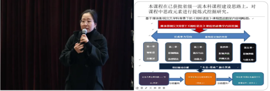 人文与国际教育学院外语系主任胡小花以《春风化雨,润物无声——<阅读与思辨·文学>的课程思政内容设计与实施》为题对省级一流课程思政教学改革进行了分享。她通过案例导入、体验演练、对比研究、讨论练习、体悟反思等形式,将英语专业技能教学和家国概念、身份认同、国际视野等思政元素结合,表示课程思政要注意自然融合、以柔克刚、顺势而为、寓知于行、牢记根本。
