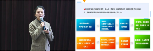 建筑与艺术设计学院信息艺术设计系张予阳就《“新国潮·新青年”新文科背景下视觉传达设计专业课程思政建设》进行了分享,她讲到在新文科建设理念下,视觉传达专业以跨界学习为基础,将传统文化、民族文化作为教学项目,贯穿教学全过程,培养学生的社会责任感,提升学生的文化自信。