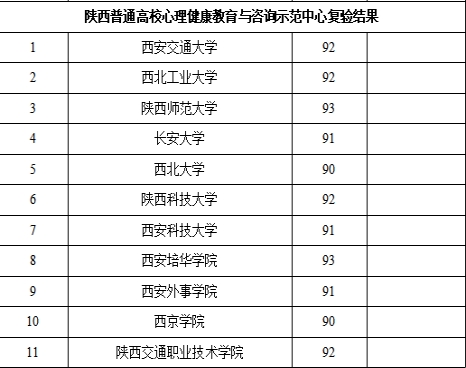 近日,中共陕西省委教育工作委员会发布了《关于陕西高校心理健康教育与咨询标准化中心验收和示范中心复验结果的通知》,其中,我校学生潜能发展中心顺利通过“陕西普通高校心理健康教育与咨询示范中心”复验,且为本次通过复验学校中的最高分。