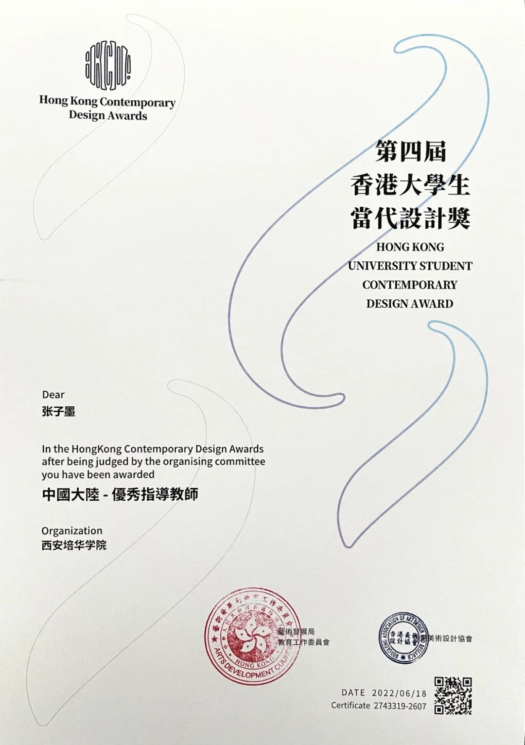 在建筑与艺术设计学院张子墨、霍东泽老师的指导下,我校视觉传达设计专业学生蔡佳倩、赵雪儿、亢榕一鸣、朱浩阳等8名学生共获得中国大陆赛区银奖6项、铜奖8项、优秀奖1项,两位指导老师分别被评为优秀指导教师。