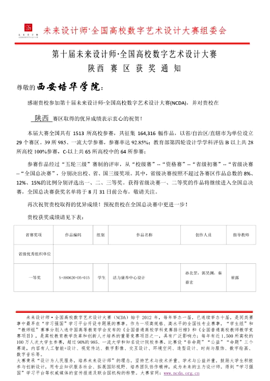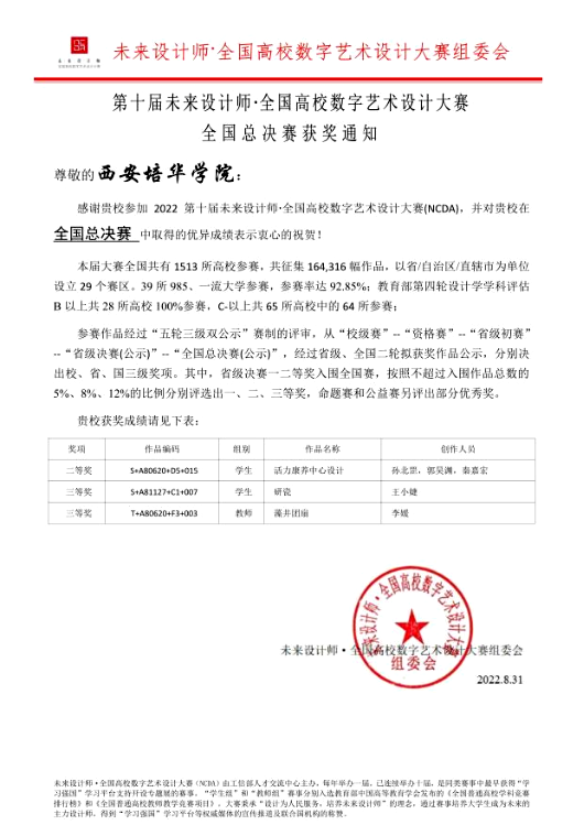 本届大赛共有1513所高校参赛,征集作品164316幅。学院高度重视本次赛事安排工作,专业教师通过线上线下相结合的方式对学生开展竞赛指导,经过专业推荐、预赛、初赛、复赛、全国总决赛五轮选拔,学校服装与服饰设计专业、环境设计专业、建筑学专业师生获国家级二等奖1项、三等奖2项;省级一等奖1项、二等奖6项、三等奖6项;西安培学院荣获省级优秀组织单位。