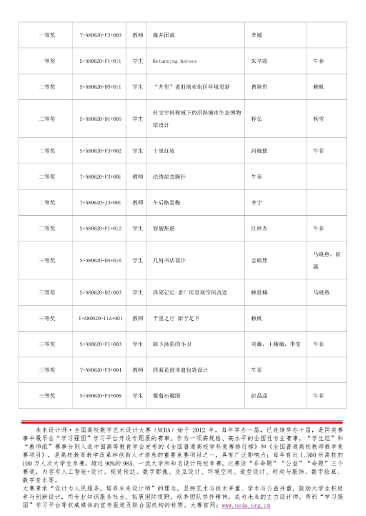 全国高校数字艺术设计大赛(NCDA)为艺术设计领域的高水平知名赛事由工业和信息化部人才交流中心主办,“学习强国”学习平台作为支持单位开设专题展示优秀获奖作品。该项赛事入选教育部中国高等教育学会发布的《全国普通高校学科竞赛排行榜》赛项,具有广泛影响力。