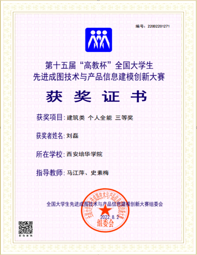 近日,第十五届“高教杯”全国大学生先进成图技术与产品信息建模创新大赛成绩揭晓。星空(中国)体育网建筑与艺术设计学院代表队刘磊同学喜获建筑类个人全能三等奖。