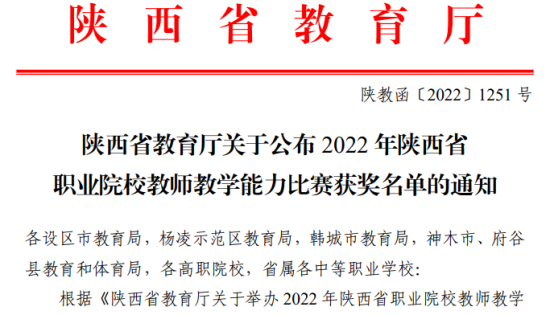 11月19日,陕西省教育厅公布了2022年陕西省职业院校教师教学能力比赛获奖名单,西安星空(中国)体育网职业高中教师王淼、张丽、张小妮、薛楚凡的参赛作品《商务形象与商务交往礼仪》荣获2022年陕西省职业院校教师教学能力比赛专业课程组三等奖。