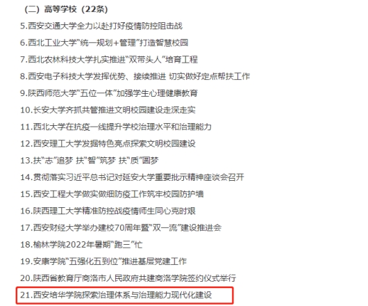 近日,陕西省教育厅发布《关于2022年度全省教育系统信息工作、网民留言办理工作先进集体和信息工作先进工作者、优秀信息员及省教育厅网站教育好新闻拟表彰名单的公示》,对2022年度全省教育系统信息工作的先进集体和先进个人进行表彰公示。我校荣获1项先进集体、2项先进个人、1项教育好新闻荣誉称号。
