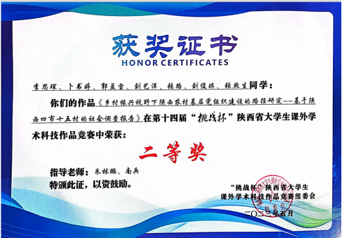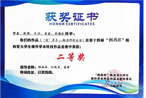 本届比赛中,学校通过团队申报、学院推荐、资格审核、现场路演等环节评选出11项作品参加省赛。最终2两项作品《“芯”卡片——助力科创生活》《乡村振兴视野下陕西农村基层党组织建设的路径研究——基于陕西四市十五村的社会调查报告》荣获比赛二等奖。