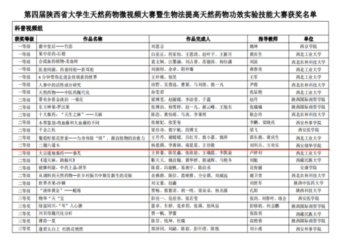 近日,由西北工业大学生命学院与陕西省天然药物学会联合主办的“天然药物资源的挖掘与提升”为主题的第四届陕西省大学生天然药物微视频大赛落下了帷幕。由我校医学院药学系刘利兵教授和方欢乐副教授指导,分别来自药学系、检验系、护理系的杨思琪、李茜硕、南星星、王佳筱4位同学组成的小组开发制作的《六翅二道木》获科普组二等奖,从省内多所高校的130项同类参赛作品中脱颖而出。