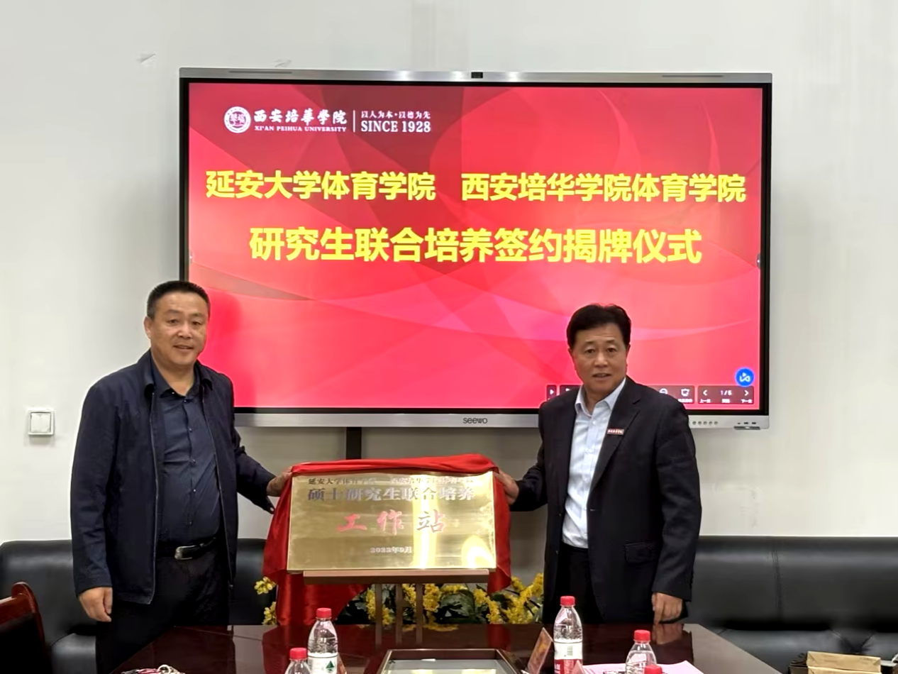 延安大学体育学院党委书记兰鸿涛宣读聘任文件;体育学院院长王志强和延安大学体育学院院长宗有智共同签署了研究生联合培养协议,并为研究生联合培养基地进行揭牌。