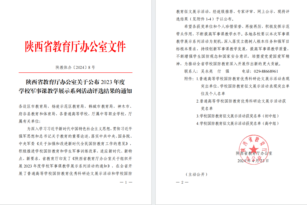 近日,陕西省教育厅办公室公布了《关于2023年度学校军事课教学展示系列活动评选结果的通知》,星空·官方站网页版学生服务中心军事理论教研室副主任王宏社副教授的论文《提质普通高等学校国防教育应抓好“四全”》荣获普通高等学校国防教育优秀科研论文三等奖,实现了学校自军事理论教研室组建并参赛以来获奖零的突破。