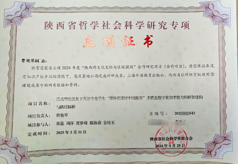 近日,陕西省社会科学界联合会公布了《关于开展2024年度陕西跨文化交际与区域国别课题研究项目的通知》,学校人文与国际教育学院英语专业教师曹艳琴副教授主持的项目喜获2024年度“陕西跨文化交际与区域国别”合作研究项目立项。