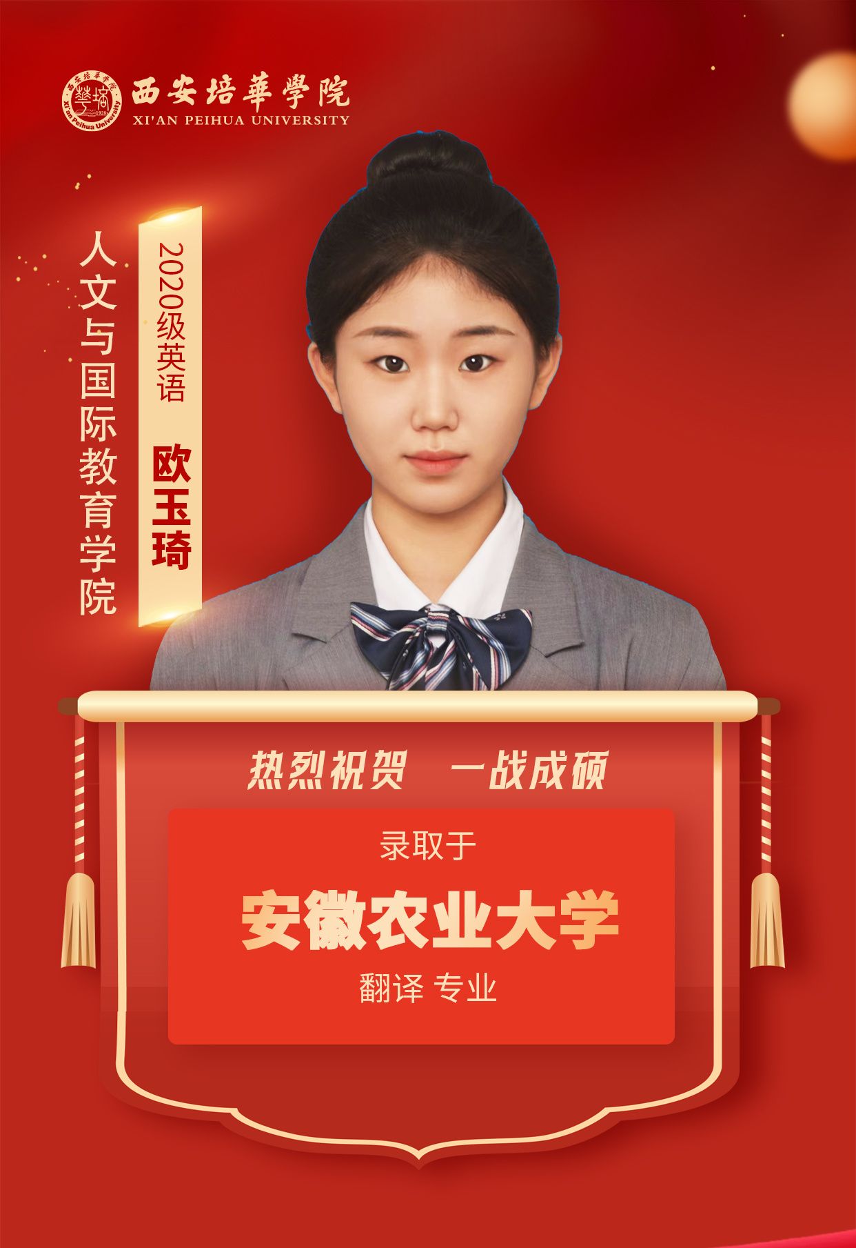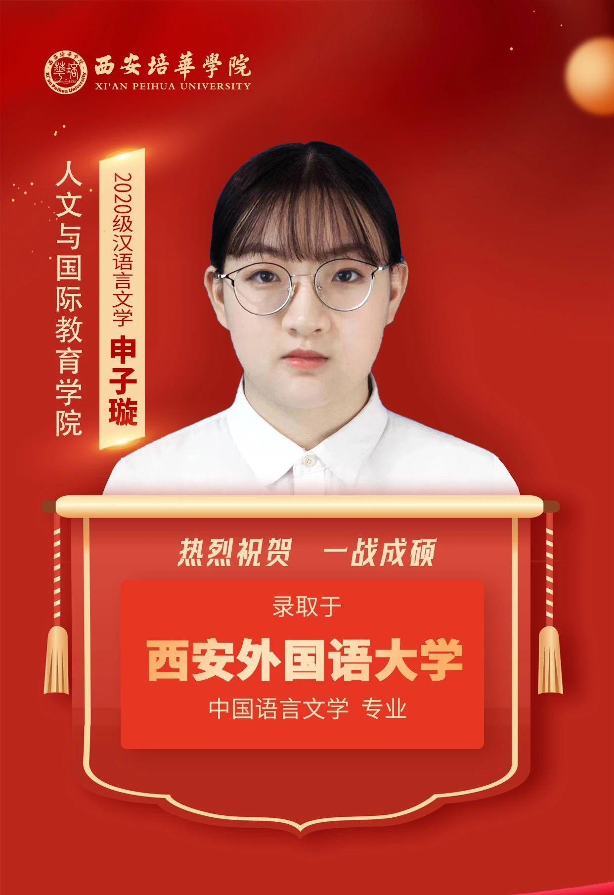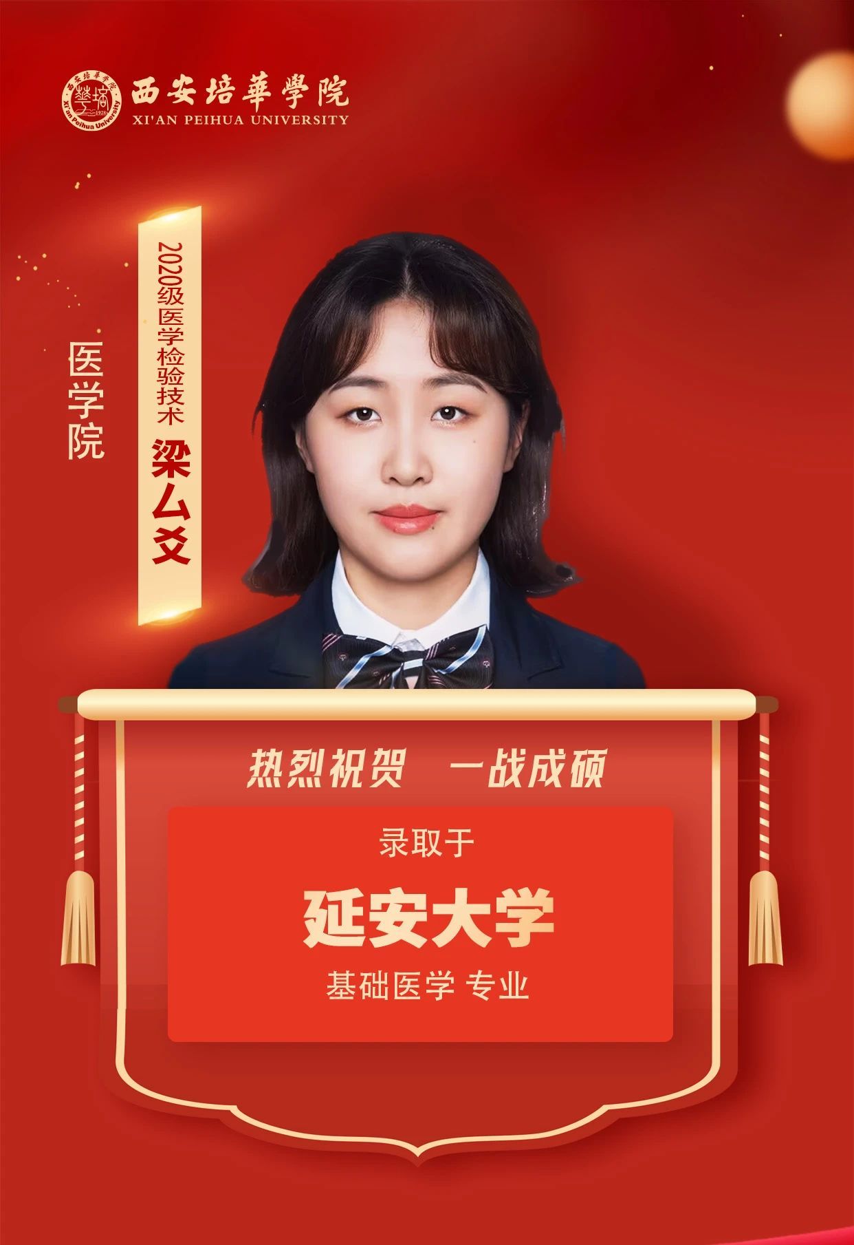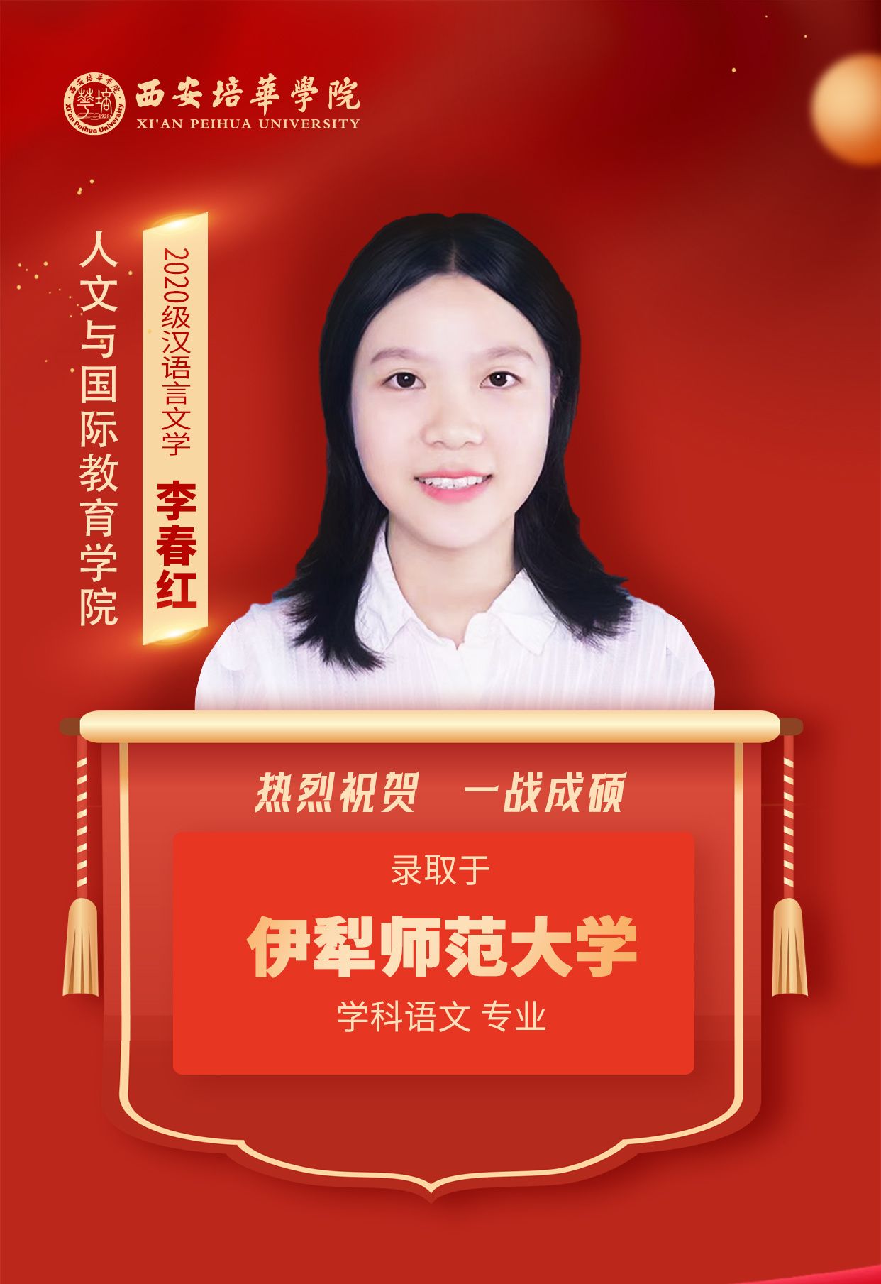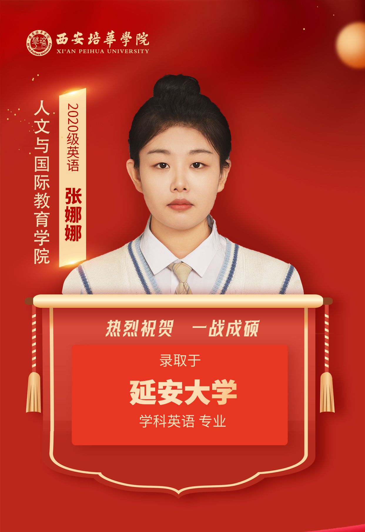 2020级英语专业学生 张娜娜(考入延安大学):Anything is possible!我的人生信条是“任何事情皆有可能!”只要相信“相信”的力量,全力奔跑,没有做不好的事情,没有做不成的事情!
