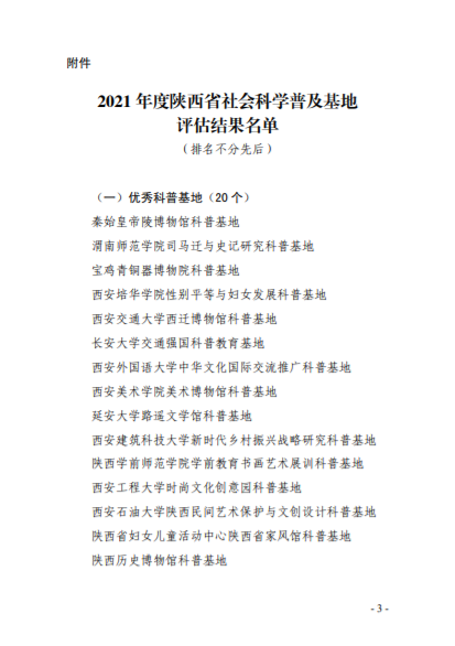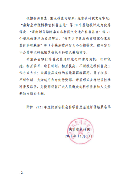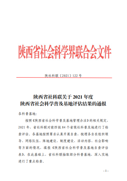 2021年12月,《陕西省社科联关于2021年度陕西省社会科学普及基地评估结果的通报》中,对于全省84个省级社科普及基地的检查评估结果进行了通报。在全面自查、重点抽查、实地考察的基础上,经省社科联党组审定,“星空·官方站网页版性别平等与妇女发展科学普及基地”在此次评估中被评定为优秀等次,位列前20名。