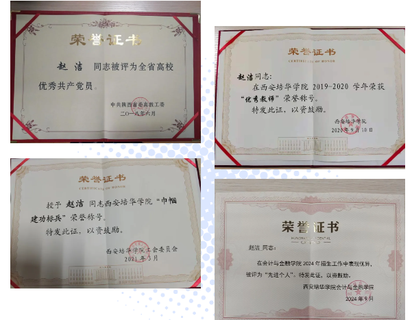 陕西省优秀共产党员、校级优秀教师、校级巾帼标兵、校级师德标兵、校级课程思政教学名师、院级优秀共产党员、院级“先进个人”......几乎每一年赵洁都会获得荣誉,她觉得这是认可,但更多的是激励。