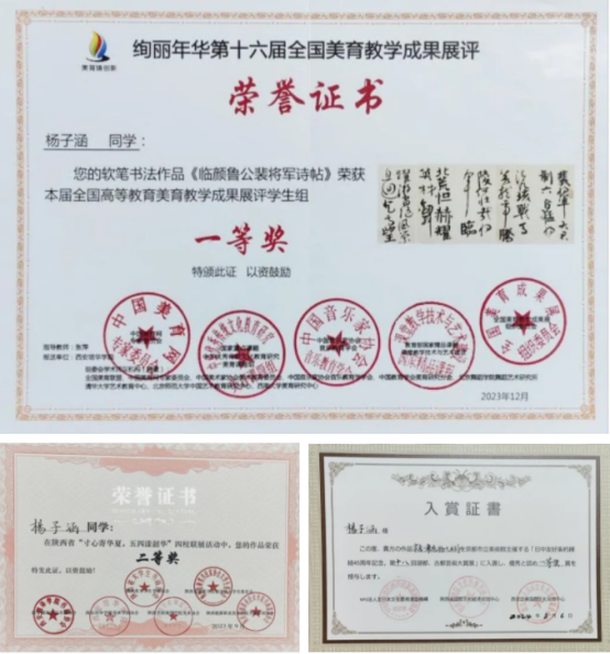 第十六届全国美育教学成果展评获一等奖、四校书画联展获银奖......丹青荟萃,妙笔生花,每一份作品或笔走龙蛇、飘逸生风,或细腻温婉、规矩谨然,一笔一划,尽显杨子涵对书法艺术的独到见解,字里行间,可窥他传统与创新并存的文人风骨。