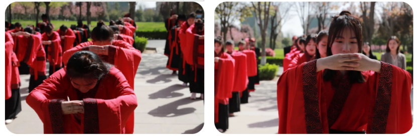 全体师生整齐列于孔子雕像前,向至圣先师行三拜鞠躬礼,表达深深敬意。