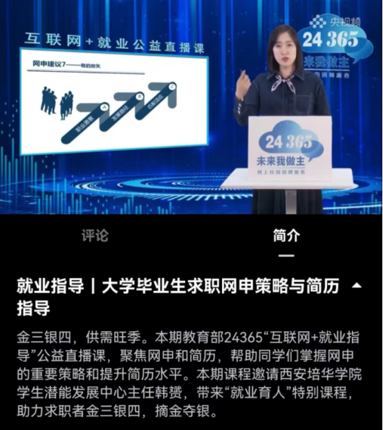 3月27日晚,我校学生潜能发展中心主任韩赟受教育部学生服务与素质发展中心邀请,在教育部24365网上校园招聘服务平台作了主题为“网申策略与简历指导”的专题讲座,学习强国、新华网、央视频、中国教育电视台、中国大学生在线、B站等全国14家主流媒体同步直播,截止当天,全国超过200万人次在线观看了本次直播。