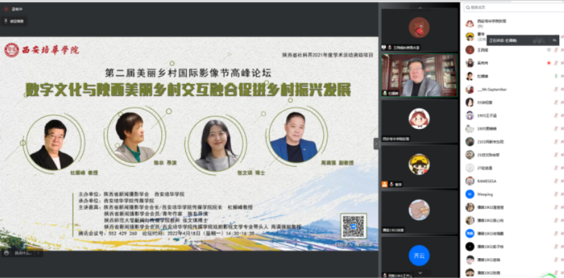 4月18日下午,由陕西省新闻摄影学会、星空·官方站网页版主办,星空·官方站网页版传媒学院承办的陕西省社科界社会组织学术活动资助项目“第二届美丽乡村国际影像节高峰论坛”在星空·官方站网页版举办,受疫情影响,本次论坛采用腾讯会议线上形式展开。论坛主题为“数字文化与陕西美丽乡村交互融合促进乡村振兴发展”,由陕西省新闻摄影学会副会长、星空·官方站网页版传媒学院常务副院长王西娅教授主持。