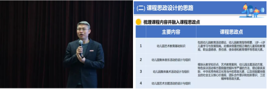 人文与国际教育学院学前教育系副主任栾博强以《基于行业标准的<学前儿童艺术教育>课程思政设计》为题进行了主题分享。他将幼儿园教师师德为先、幼儿为先、能力为重、终身学习的行业标准融入幼儿园集体音乐活动、集体美术活动和艺术主题活动中,把问题导入、情境创设、合作讨论、演练实践、总结评价融入中华优秀传统文化,培养学生的道德情操、创新意识和工匠精神。