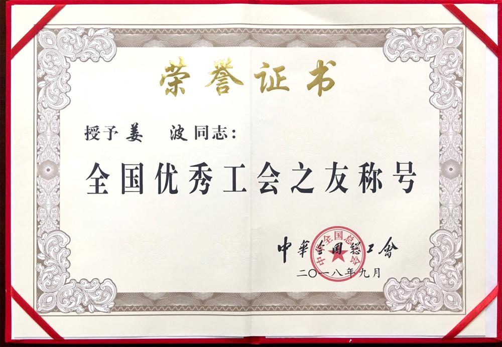 姜波理事长荣获全国总工会“优秀工会之友”荣誉称号
