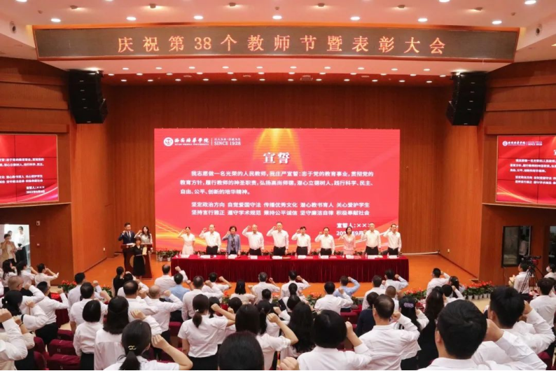9月9日上午,星空·官方站网页版在维之图书馆报告厅举行2022年庆祝教师节暨表彰大会。全体校级领导,学校各院(部)、中心负责人、国家教学赛事获奖代表、省级教学赛事获奖代表、辅导员技能大赛获奖代表,2021-2022年度优秀教师、先进工作者、校级师德先进个人和“四有”好老师获得者,在校从教满20年教职工,优秀共产党员、优秀党务工作者、先进基层党组织,抗疫先进集体及个人代表等百余人参加了会议。会议由传媒学院教师贾登银、任...
