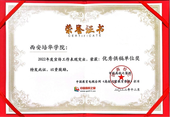 近日,学校获评中国高校之窗网“优秀供稿单位奖”,对我校2022年度宣传工作予以肯定。多年来,学校党委宣传部(新闻中心)主动作为、踊跃投稿、全面展示,用精彩稿件多角度、全方位展示学校的工作亮点,及在学生服务、疫情防控、校园文化等方面优秀成绩,展现了学校弘扬中华传统文化、营造良好校园文化氛围的丰硕成果,为学校三全育人奠定了坚实的舆论基础
