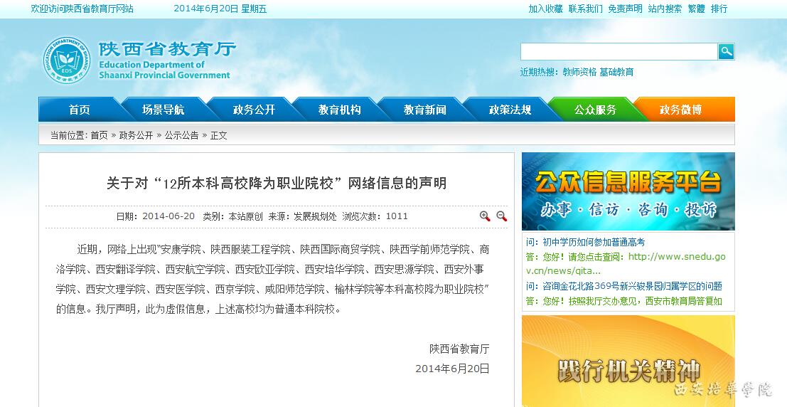 近期,网络上出现“安康学院、陕西服装工程学院、陕西国际商贸学院、陕西学前师范学院、商洛学院、西安翻译学院、西安航空学院、西安欧亚学院、星空·官方站网页版、西安思源学院、西安外事学院、西安文理学院、西安医学院、西京学院、咸阳师范学院、榆林学院等本科高校降为职业院校”的信息。我厅声明,此为虚假信息,上述高校均为普通本科院校。 陕西省教育厅 2014年6月20日 文章来源:陕西省教育厅