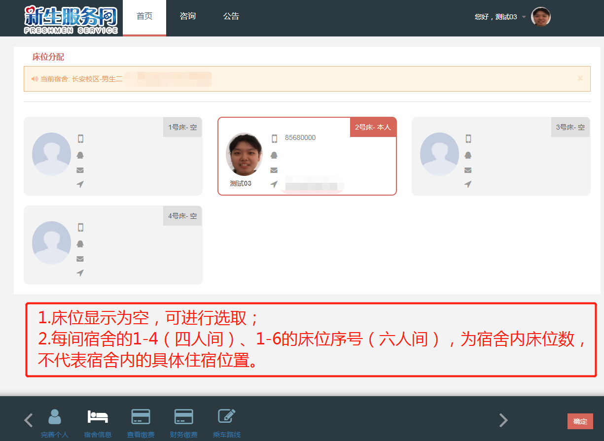 点击“宿舍信息”,新生根据自己需求,可直接选取到宿舍房号;每间宿舍的1—4或1—6的序号,为宿舍内床位数,不代表宿舍内的具体住宿位置,具体床位号到宿舍后随机选择;