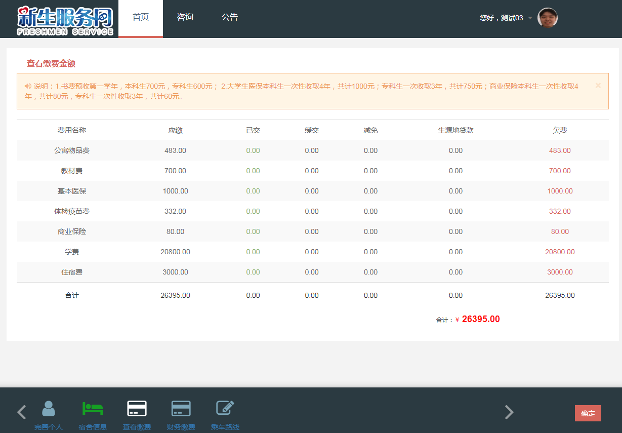 4. 享受新生奖学金的学生,奖学金已在本期应缴学费中冲减,分类考试录取新生提前已经缴纳的部分学费,已在本期应缴学费中冲减。凡已经冲减的费用,系统显示的应缴额度为其应缴差额(即 :还应缴纳的额度)。
