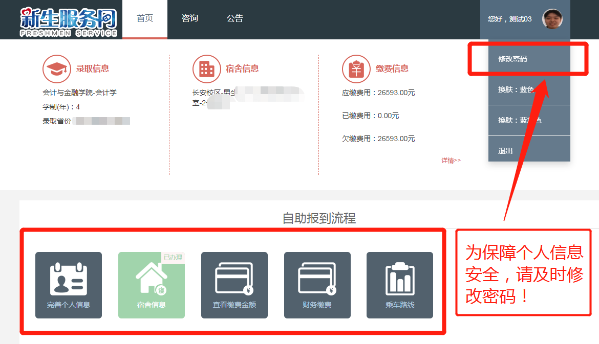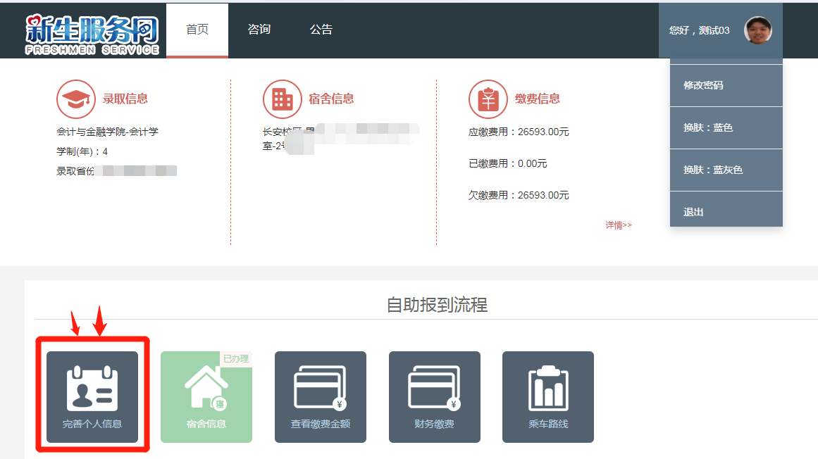 密码修改完成后,进入网上报到注册流程页面,点击“完善个人信息”根据系统提示,按要求如实填写个人信息,信息填写完毕后,点击进入查看宿舍信息,选取宿舍,不完善个人信息,无法进入“宿舍选取”环节;