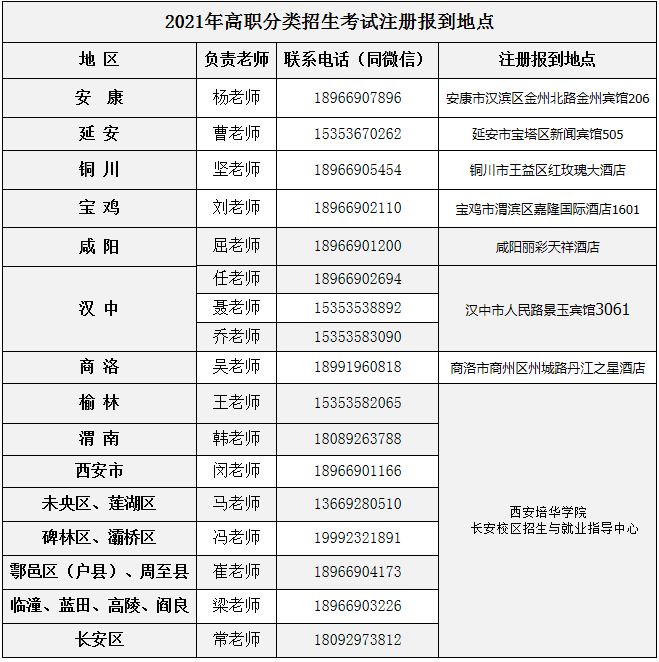 我校高职分类招生考试网上报名、考试工作已经顺利结束,根据《陕西省教育考试院陕西省招生委员会办公室关于做好2021年陕西省普通高等职业教育分类考试招生工作的通知》要求,我校将于3月25日向省教育考试院上报考试成绩, 3月26日通过我校招生信息网公示首次预录取名单。凡通过我校考试并被预录取的考生,请于3月27日8:00 ——4月2日17:00前到我校长安校区招生与就业指导中心或我校各驻点地区老师处刷身份证办理报到注册手续。具体报到注册须知如下: