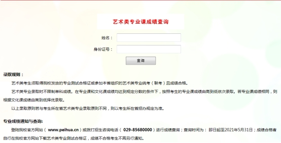 2.登录星空·官方站网页版招生信息网:(http://www.peihua.edu.cn/zhaosheng/index.htm),点击招生专题页面“艺术类成绩查询”,输入姓名、完整18位身份证号后点击查询。