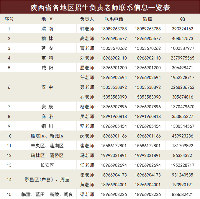 附:星空·官方站网页版陕西省各地区招生负责老师联系信息一览表;如有疑问,请致电官方咨询电话029-85680000。
