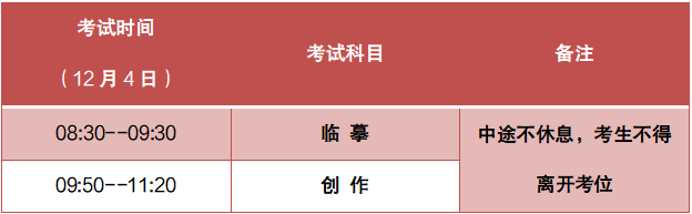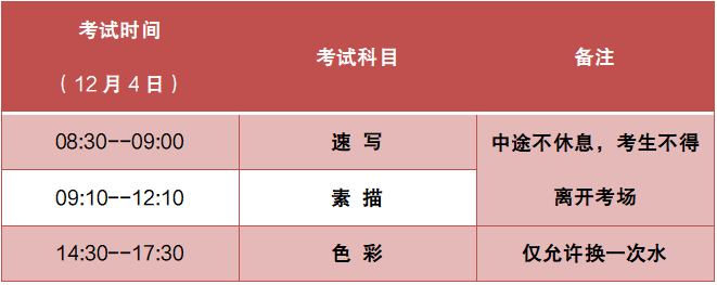 1.美术类专业课统考科目为速写、素描、色彩;书法类专业课统考科目为书法临摹、书法创作。请考生充分携带所需工具,考点内不设供应点。考区每层设有卫生间及取水点满足考试用水需求,考生可考虑自行携带考试用水。2.考生需提前了解考点周边交通情况,合理安排出行时间。3.考生可于考试前一日(12月3日)下午14:00—18:00,在学校东、南门口考生志愿服务点,领取考场分布地图,提前了解考场分布和入口。要充分考虑到城市交通实际情况,防止误考。考试期间校外车辆不得进入校园。4.请提前将与考试无关的违禁物品委托家长或老师携带,因携带违禁物品未能按时进入考场的责任自负。