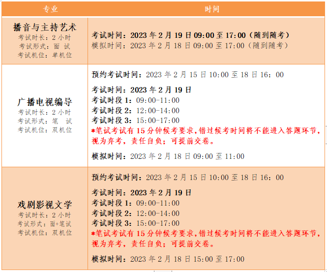 预约考试时间:2月15日-18日(播音与主持艺术专业无需预约)