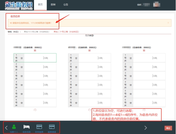 点击“宿舍信息”,新生根据自己需求,可直接选取到宿舍房号;每间宿舍的1—4或1—6的序号,为宿舍内床位数,不代表宿舍内的具体住宿位置,具体床位号到宿舍后随机选择;
