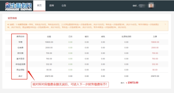 第六步:查看缴费金额(温馨提醒:宿舍选择完成一小时后,再进行缴费)