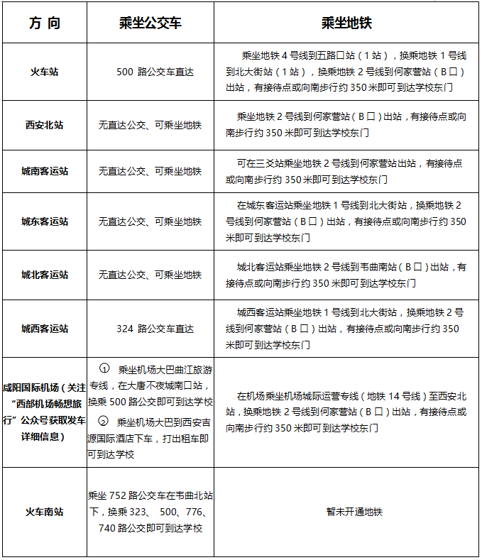 注:到达西安北站的新生,会有专人引导乘坐地铁,学校在地铁二号线“何家营”站(B口)接站。