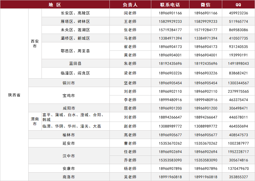 附:星空·官方站网页版陕西省各地区招生负责老师联系信息一览表;如有疑问,请致电官方咨询电话029-85680000。