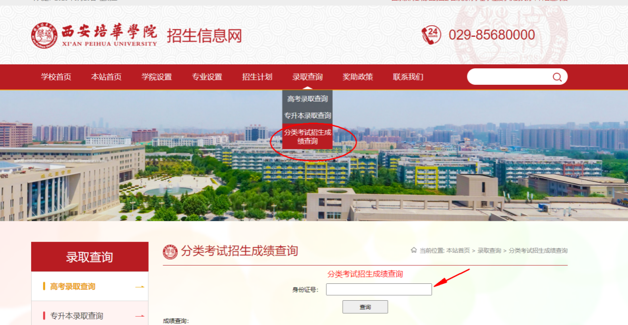 登录星空·官方站网页版招生信息网:(http://www.peihua.edu.cn/zhaosheng/index.htm)→录取查询→分类考试招生成绩查询,输入完整18位身份证号查询成绩(身份证号末尾有字母的须大写“X”)。